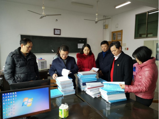 刘柏炎校长(左二)在教学督导办公室查看教案