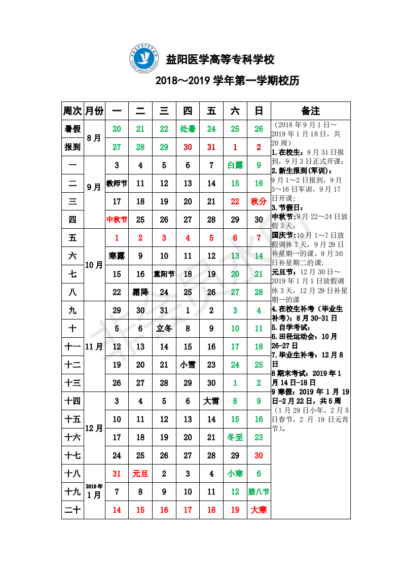 2018-2019学年第一学期校历