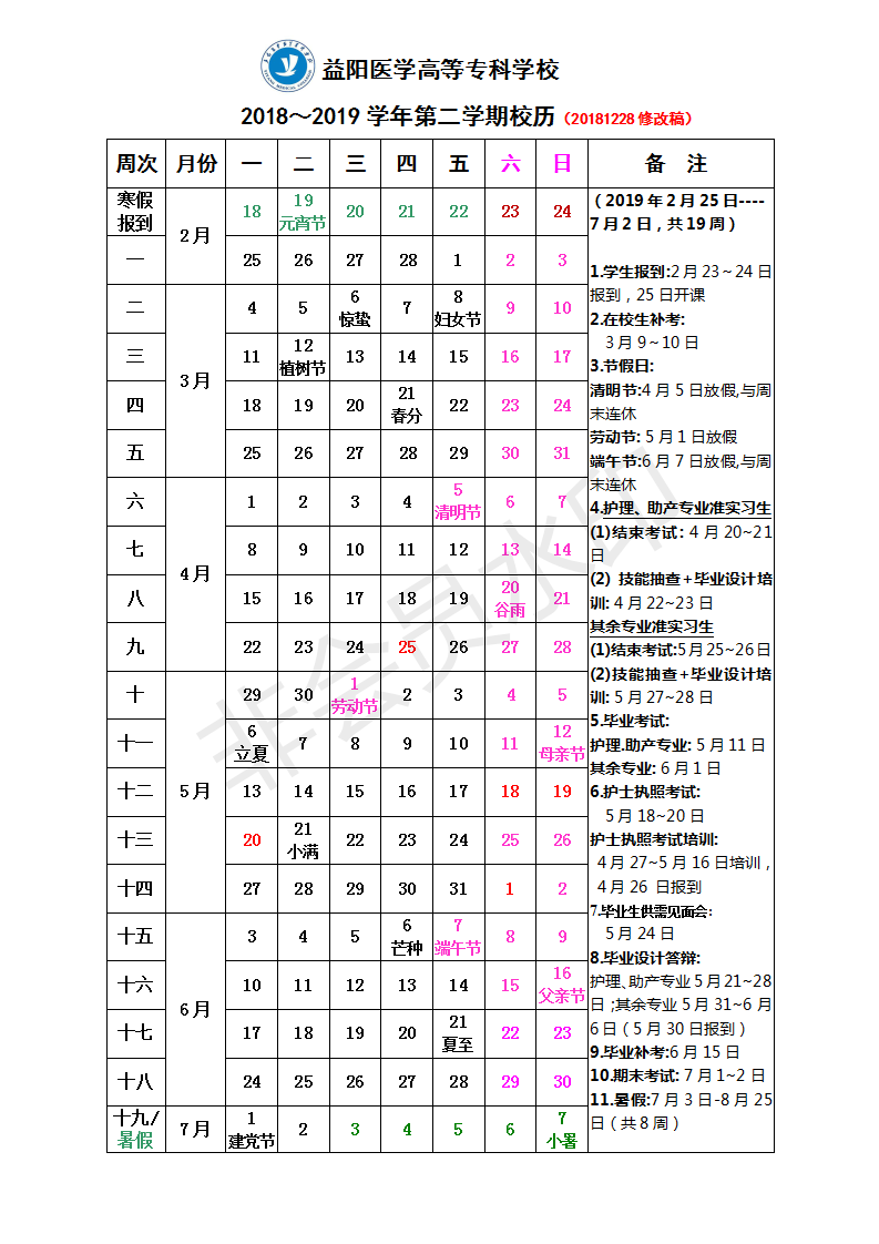 2018-2019学年第二学期校历