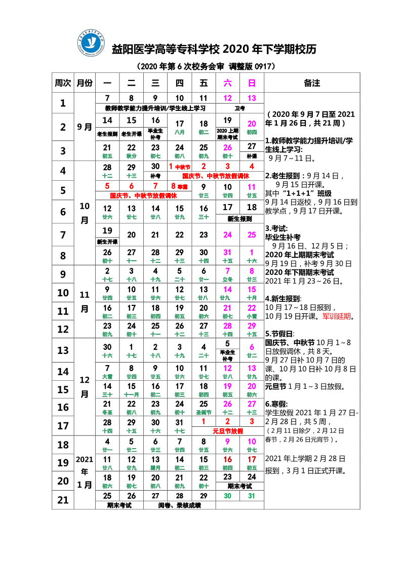 2020-2021学年第二学期校历