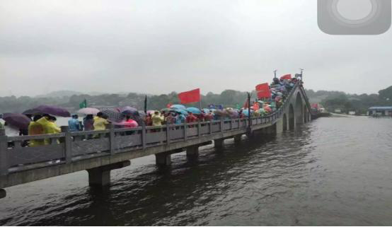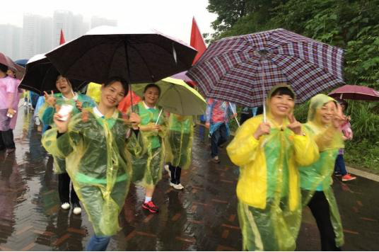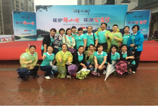 当天,虽然刮风又下雨,可队员们的热情依然不减。活动开始后,大家撑着雨伞,穿着雨衣,从佳宁娜广场出发,沿梓山湖环湖栈道,前往梓山湖领御前坪广场。一路上,大家结伴而行,有说有笑,沿途欣赏着梓山湖的优美风景,随手抓拍着美丽动人的瞬间,约四十分钟后大家走完4公里路程,陆续到达终点,兴致勃勃在“创建文明城市、交通模范城市、禁毒宣传”千人横幅上签名并合影留念。大家擦着汗水兴奋地说,希望市总工会和学校工会多组织这样的活动。