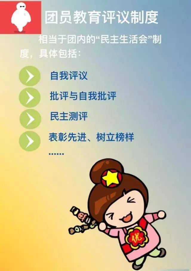 团员教育评议制度是团的组织生活的重要组成部分,是加强团员队伍思想建设、严格团的纪律、规范团员管理的重要措施。团员教育评议采用学习教育、自我评价和组织评议相结合的方式,对团员的表现和作用发挥情况作出综合评价,并通过评优和处理等方式,达到激励团员、整顿队伍、纯洁组织的目的。