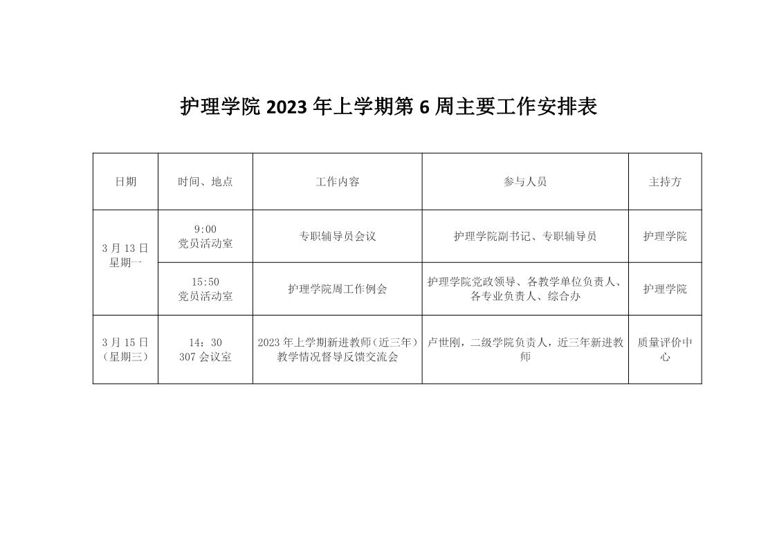 护理学院2023年上学期第6周主要工作安排表