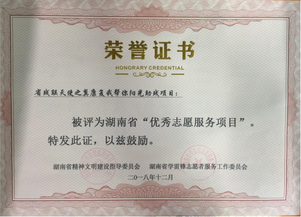 该项目2015年被评为益阳市年度十佳志愿服务项目;2015年度共青团益阳市委优秀工作项目;2016年在湖南省首届青年志愿服务项目大赛中获得银奖;2017年被评为湖南省结对帮扶优秀志愿服务项目;2018年被益阳市残联授予助残先进集体称号;2018年被湖南省残联授予“结对帮扶优秀志愿服务项目”称号,最近又获得2018年度“湖南省优秀志愿服务项目”称号。