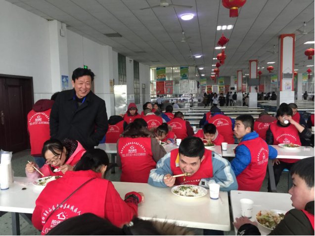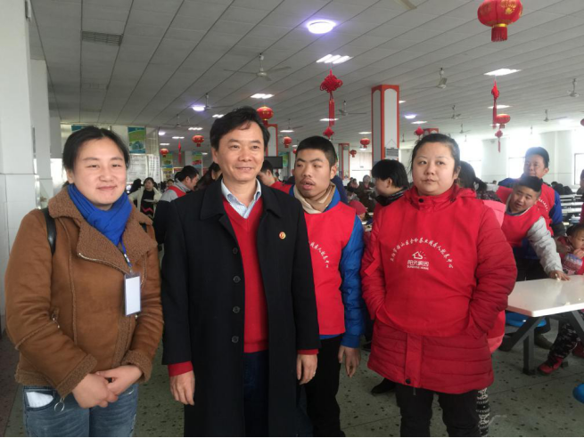 后勤处食食堂负责人崔志坚在询问残疾朋友们饭菜是否合口