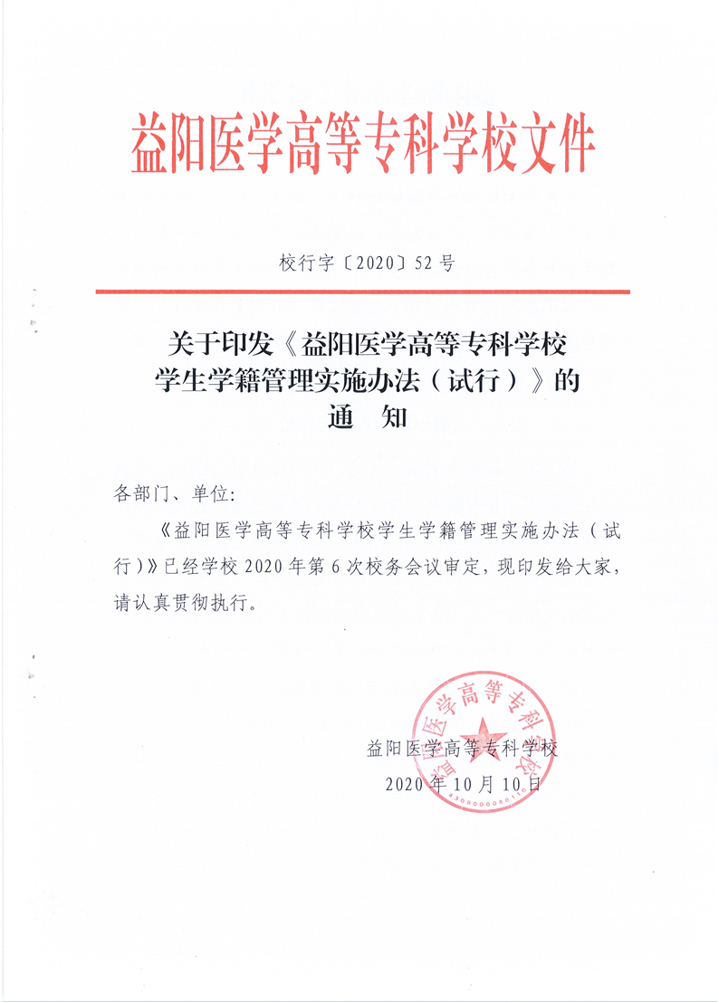 校行字〔2020〕52号益阳医学高等专科学校学籍管理实施办法(试行)最终版 来源: 发布时间:2021-06-07 14:46:56 浏览次数: 次 【字体:小 大】 终审:检验系 分享到: 【打印正文】