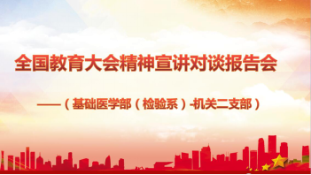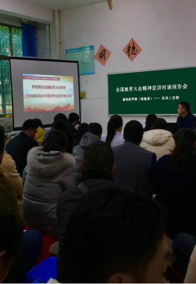 2018年12月5日下午2点,基础医学部(检验系)与机关二支部在13栋一楼解剖第七实验室举行了全国教育大会精神宣讲对谈报告会,基础医学部(检验系)与机关二支部共60多人共聚一堂,认真聆听了刘高华副校长关于“深入学习习近平新时代中国特色社会主义教育理论,贯彻落实全国教育大会精神,开启建设高水平医学职业院校新征程”的宣讲报告,会议由系部主任刘伏祥同志主持。