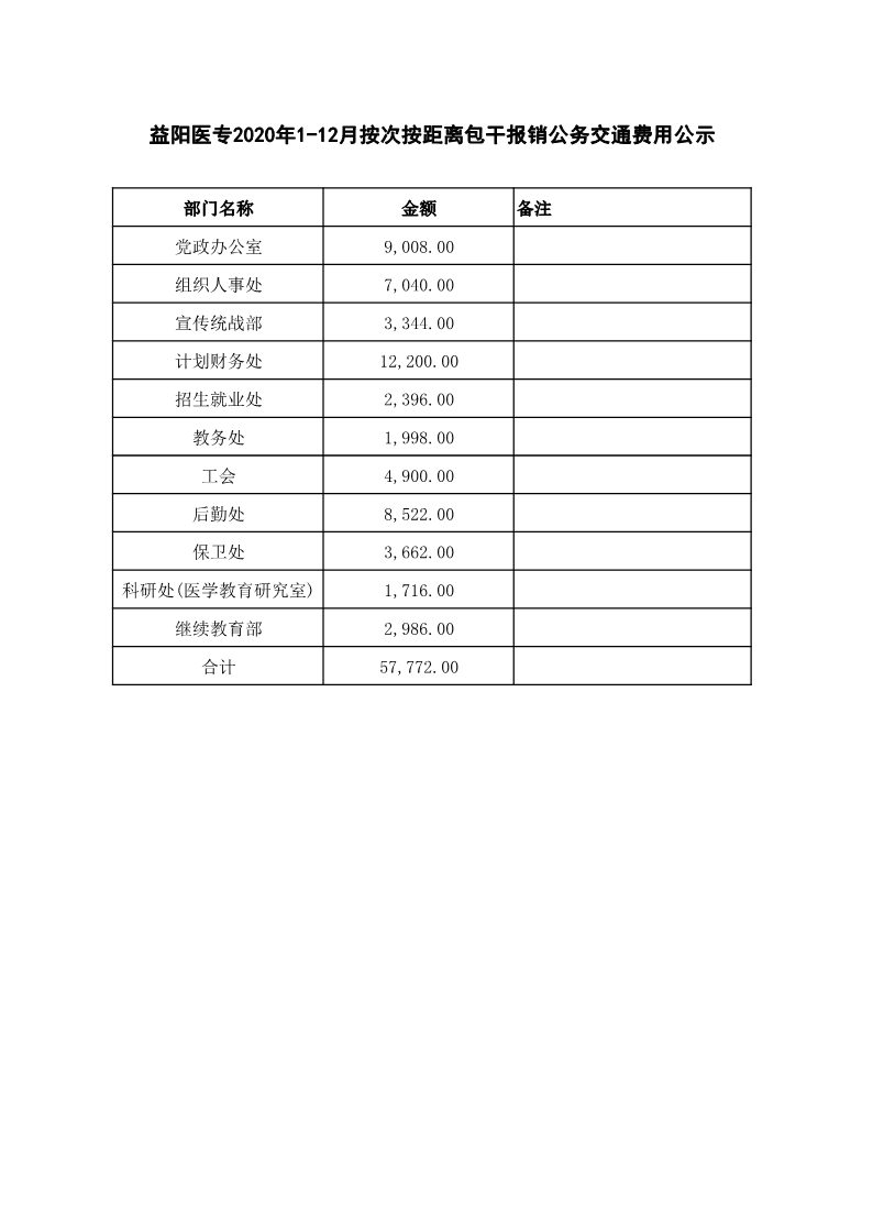 益阳医专2020年1-12月按次按距离包干报销公务交通费用公示