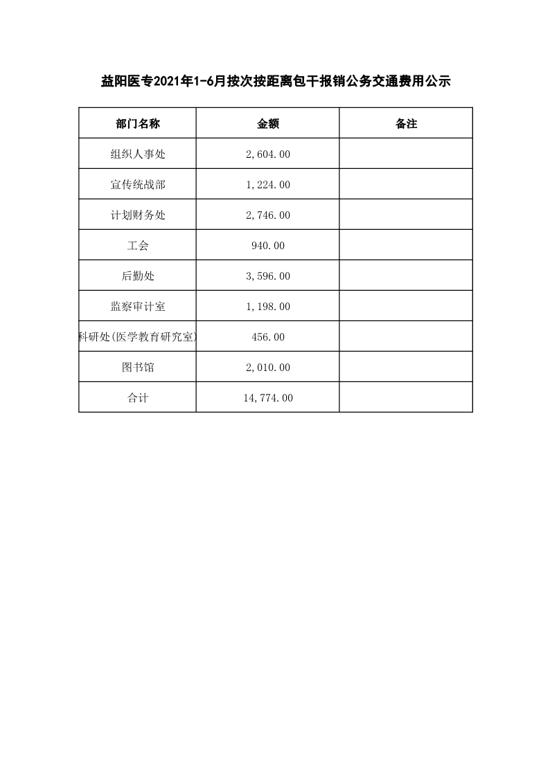 益阳医专2021年1-6月按次按距离包干报销公务交通费用公示