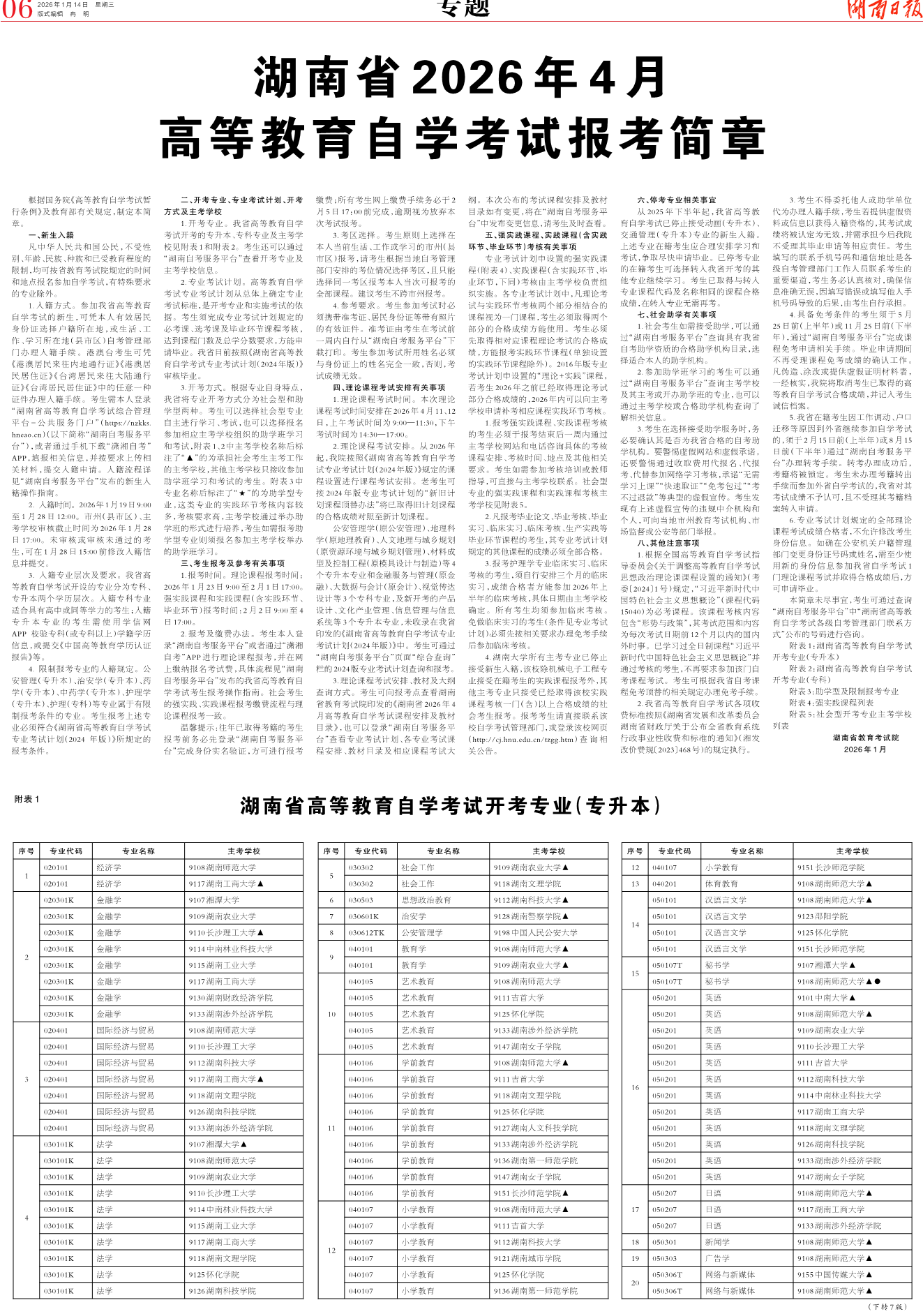湖南省2026年4月高等教育自学考试报考简章