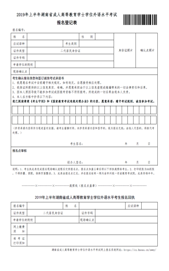 附件:2019年上半年湖南省成人高等教育学士学位外国语水平考试报名登记表