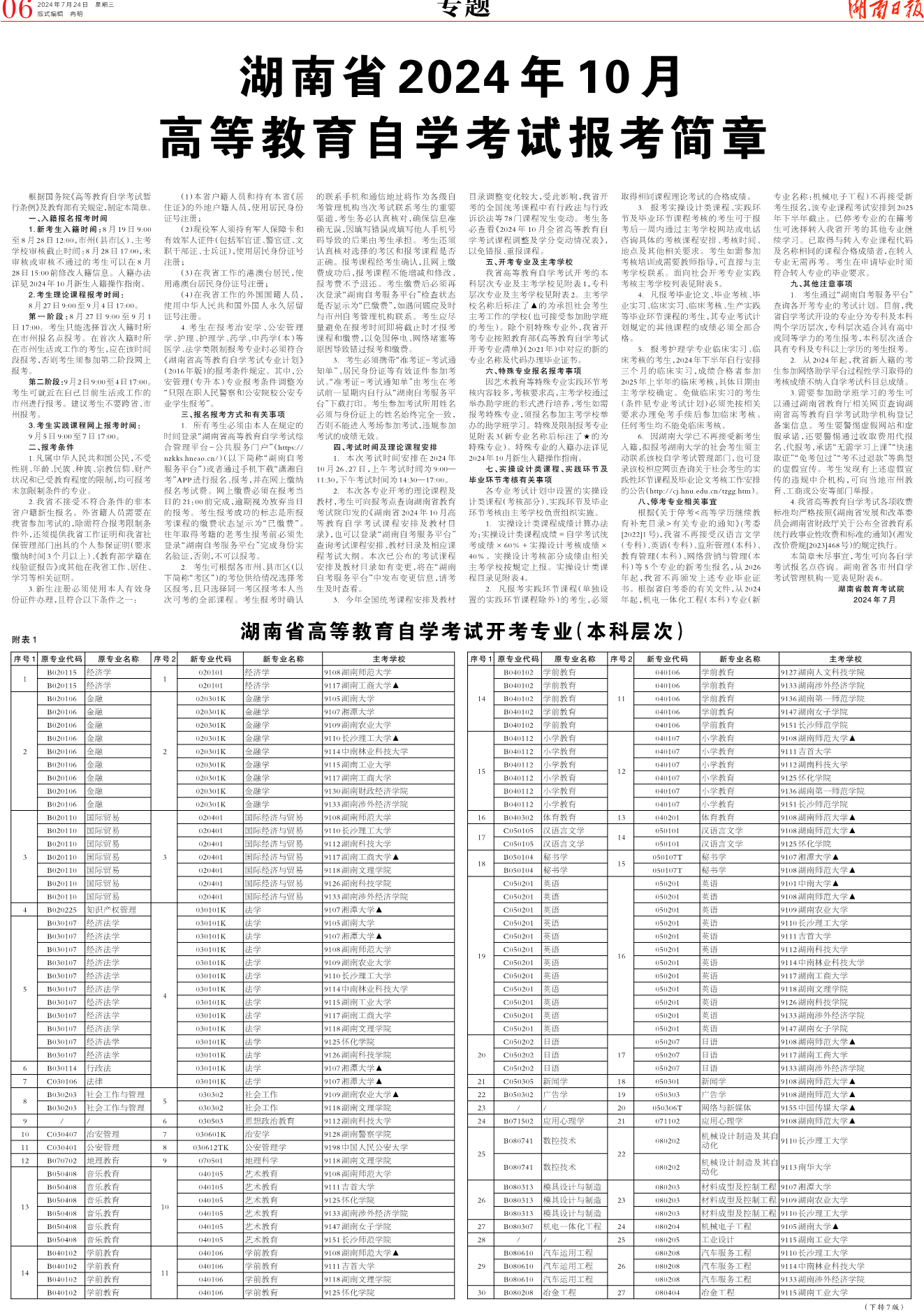 湖南省2024年10月高等教育自学考试报考简章