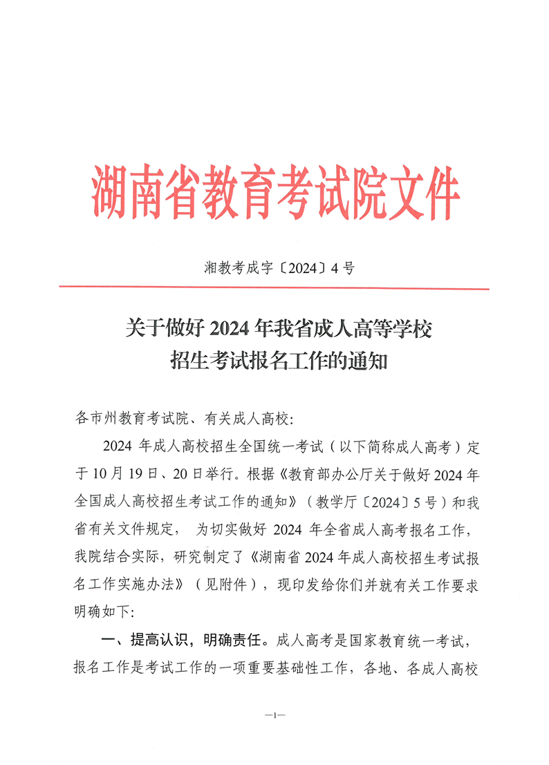 关于做好2024年我省成人高等学校招生考试报名工作的通知湘教考成字〔2024〕4号 来源: 发布时间:2024-09-05 09:50:29 浏览次数: 次 【字体:小 大】 终审:继续教育部 分享到: 【打印正文】