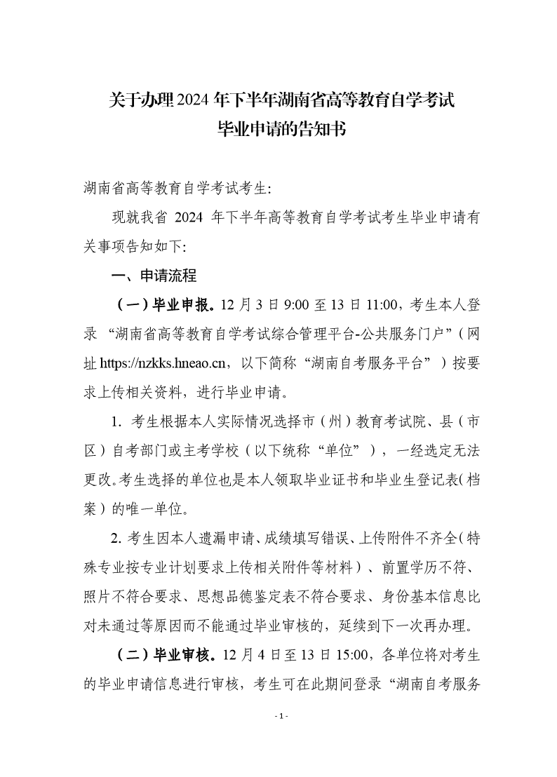 关于办理2024年下半年湖南省高等教育自学考试 毕业申请的告知书