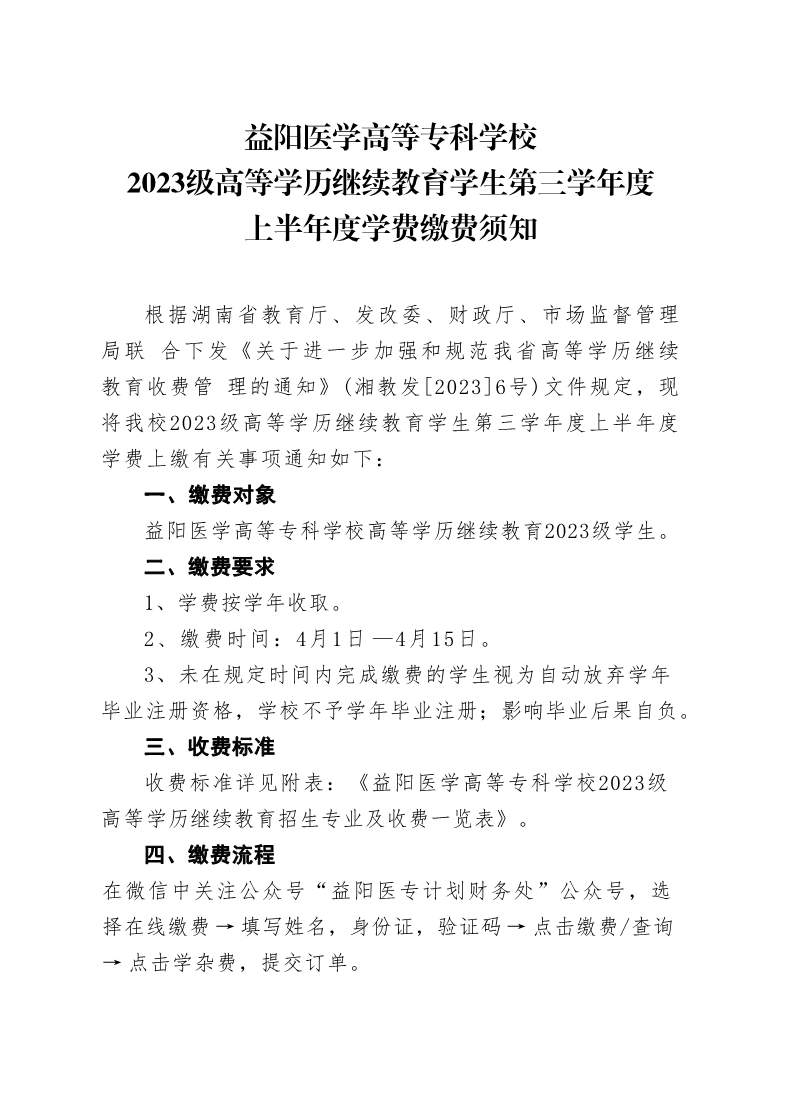 益阳医学高等专科学校2023级高等学历继续教育学生第三学年度上半年度学费缴费须知 来源: 发布时间:2025-03-28 14:06:13 浏览次数: 次 【字体:小 大】 终审:继续教育部 分享到: 【打印正文】