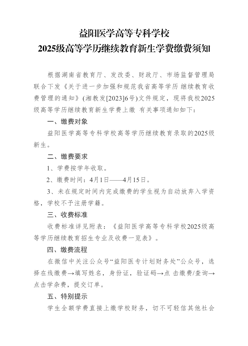 益阳医学高等专科学校2025级高等学历继续教育新生学费缴费须知