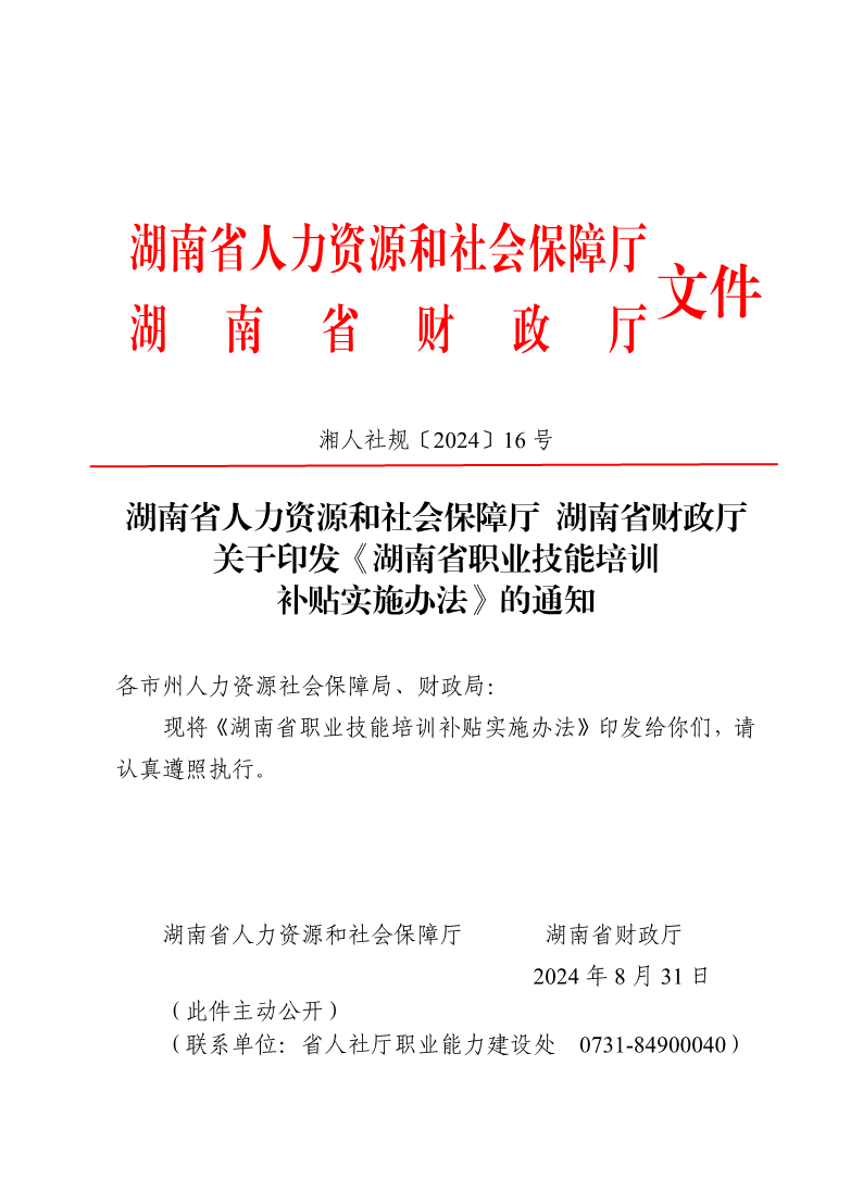 湖南省人力资源和社会保障厅 湖南省财政厅关于印发《湖南省职业技能培训补贴实施办法》的通知(湘人社规〔2024〕16 号) 来源: 发布时间:2024-09-13 15:39:28 浏览次数: 次 【字体:小 大】 终审:继续教育部 分享到: 【打印正文】