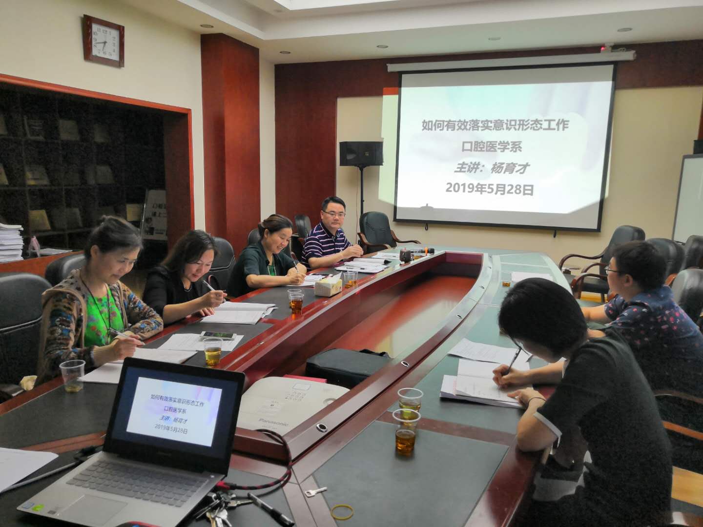 5月29日晚间,在口腔医学系劳模创新工作室,系部领导班子及教研室主任听取了系总支书记杨育才《如何有效落实意识形态工作》的讲座。杨书记从什么是意识形态工作、为什么要实行意识形态工作、怎么落实意识形态工作三个层面详细进行了阐述。他强调意识形态工作与党的前途命运、国家长治久安,与民族凝聚力、向心力息息相关,我们要以学习习近平总书记讲话精神作为重中之重,培育和践行社会主义核心价值观,有效落实意识形态各项工作。