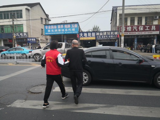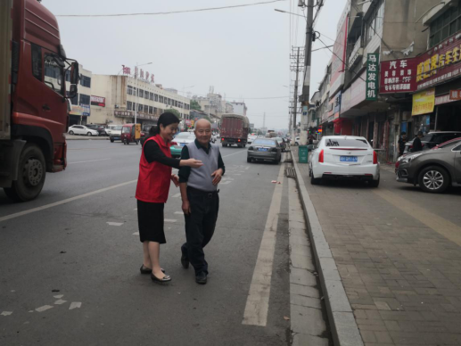 党员志愿者劝导老人走人行道