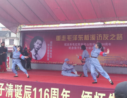 公祭仪式后,由张惠军、何苗指导志愿者义演小分队6名舞蹈演员编排的情景舞剧《芳华:红军小井医院.师长献盐》在张子清村委会演出。“世上有朵英雄的花,那是青春放光华。花载亲人上高山,顶天立地迎彩霞,一路芬芳满山崖。”伴着一曲婉转动人的《芳华》片尾曲,志愿者们以舞蹈的形式完美演绎了年轻的张师长从指挥接龙桥战役到受伤入住红军小井医院、再到“师长献盐的”动人故事情节。表演过程中,在场的群众鸦雀无声,“师长献盐”的感人场景让台下不少观众落泪。
