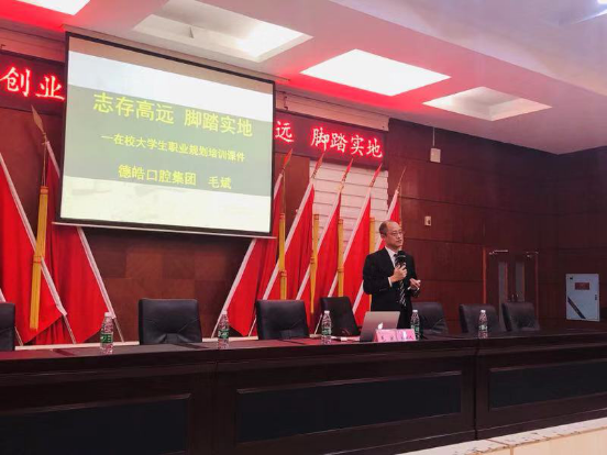 德皓口腔集团董事长毛斌作《志存高远 脚踏实地》专题授课。他从中国口腔疾病流调情况、口腔医疗市场需求现状和行业发展形势分析、口腔医务人员复合技能解析、德皓口腔集团经营理念等几个方面侃侃而谈,深入浅出的阐述、风趣幽默的语言赢得现场阵阵掌声。
