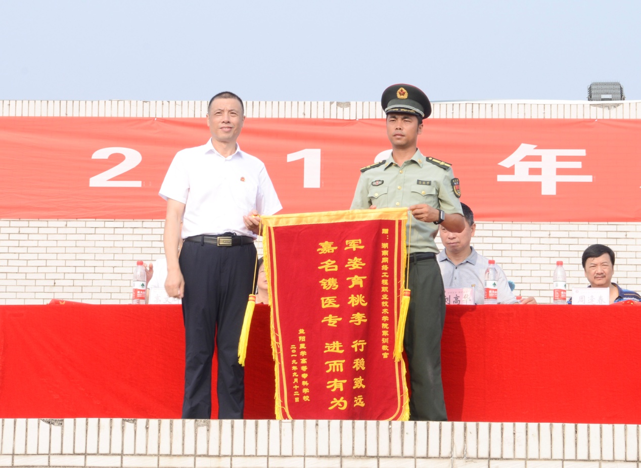 “军姿育桃李,行稳致远;嘉名镌医专,进而有为。”周逢春代表学校向承训单位赠送锦旗。