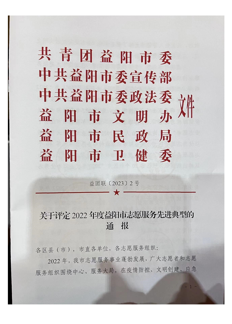 2月28日,共青团益阳市委、中共益阳市委宣传部、中共益阳市委政法委、益阳市文明办、益阳市民政局、益阳市卫健委对2022年益阳市志愿服务先进典型进行了表彰,“益阳医学高等专科学校‘天使之翼·护民安康’项目”获评“2022年度益阳市优秀志愿服务项目”,邓思慧老师获“2022年度益阳市最美疫情防控志愿者”。
