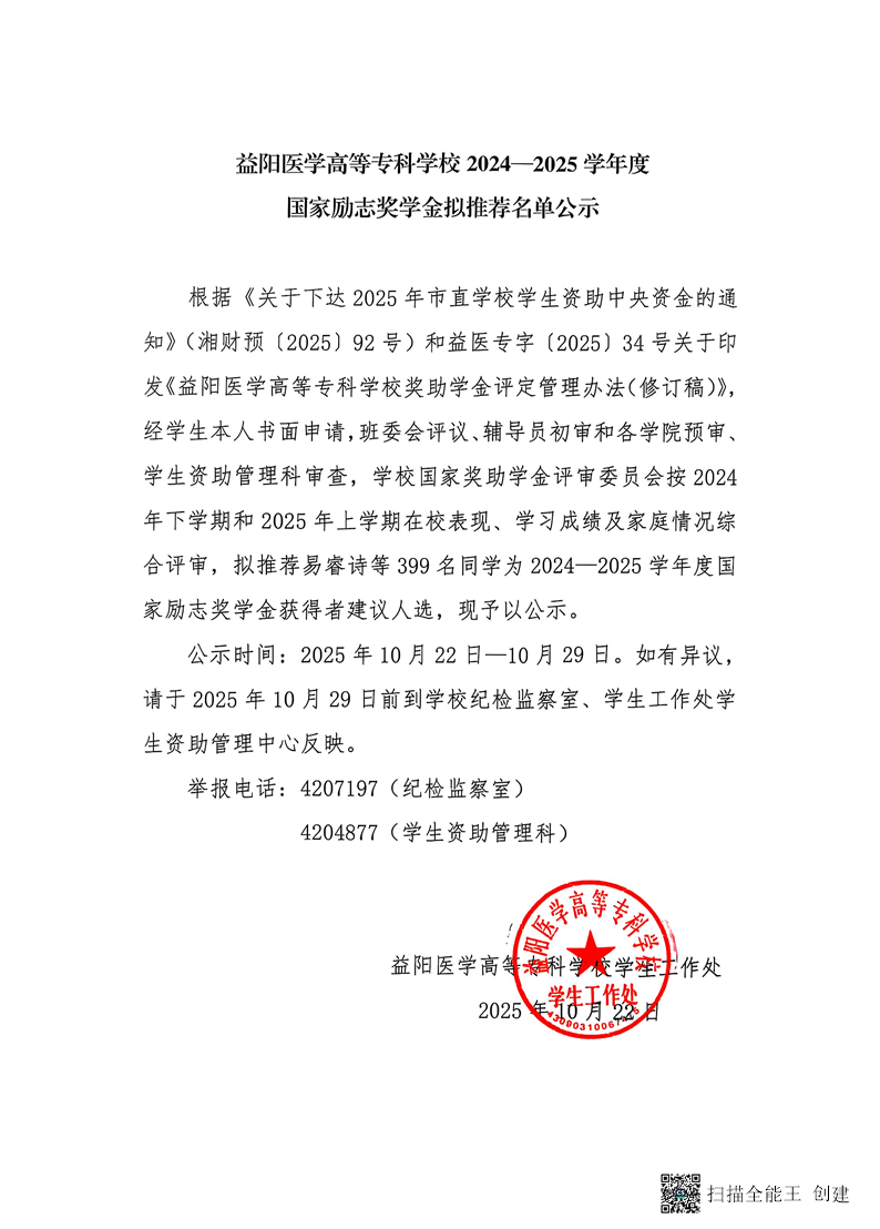 益阳医学高等专科学校2024-2025学年度国家励志奖学金推荐名单公示