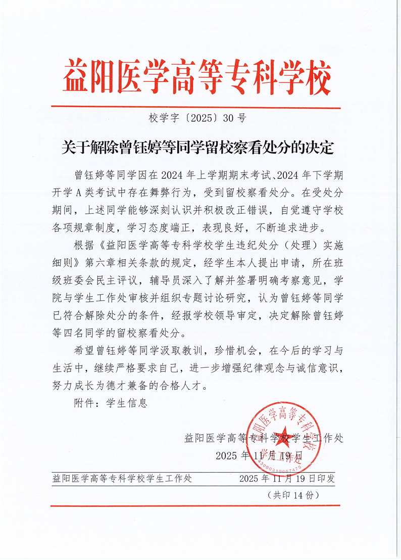 校学字〔2025〕30号关于解除曾钰婷等同学留校察看处分的决定