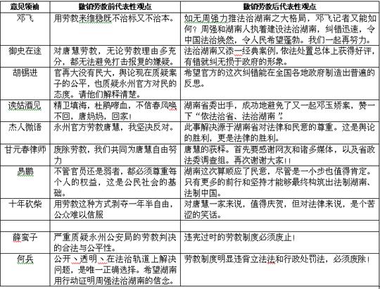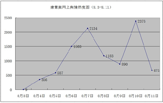 唐慧劳教案事件网络舆论关注度走势 单位:篇(数据来源人民网舆情监测平台) 8月4日,新浪认证微博“永州市公安局”就此事发布回应,由于发布后又删除等举动引发舆论强烈反弹,众多意见领袖发声,引发第一波关注潮。 8月5日晚,人民日报官方微博发布唐慧相关消息,一天内转发超过10万次。人民网官方微博6日零点28分发出评论,质疑劳教决定。舆论关注度猛涨。 8月6日,湖南省政法委成立调查组赴永州调查此案办理情况。8月7日,各重点新闻网站持续关注事件动态,达到第一个舆论高峰。同时舆情开始分化向好,呈现出同情唐慧与对期待结果并重的状态。随后数天公众等待调查结果,舆论关注度进入下行通道。 8月10日,媒体披露唐慧劳教决定经复议被依法撤销,该消息引发网上500多家网站转发,媒体评论呈现井喷状态。 三、舆情应对过程 8月2日,唐慧的代理律师甘元春在微博爆料,引发网友关注的同时,也引起了湖南省和永州市有关部门的高度重视,通过网站和微博多方回应。 永州市公安局回应:永州市公安局共有两次回应。4日上午11时,其通过其官方微博发布了一条内容只有“幼女”两个字的微博,迅速引起网民关注。一小时内,该条微博被转发4000余次。下午,永州市公安局通过同一平台,连续发布了12条“就唐慧被执行劳动教养回复网民”的长微博,称唐慧闹访、缠访、散发传单,严重扰乱了单位和社会秩序,永州市劳动教养管理委员决定对其劳动教养1年6个月。随后这些信息均被删除。 5日,永州市公安局再次通过其新浪官方微博发布《关于唐慧被执行劳动教养相关情况的说明》、《关于对“永州公安帮被告人做假立功”情况的说明》对事件进行回应,称:唐慧为达到“判处7名被告人死刑”等目的,多次上访,严重扰乱了单位秩序和社会秩序,造成了极坏的社会影响,故对其劳教决定。回应还称,秦某、汪某制止周某某自杀事实存在,没有发现公安民警帮被告人做假立功的情况。 湖南省政法委回应:6日,湖南省政法委出面回应称:对永州幼女被强奸、其母唐慧反映的有关情况高度重视,已成立调查组赴永州调查此案办理情况。调查组分成5个小组,对涉及强奸、劳教、‘假立功’、秦星与警界人士之间的关系5个方面分别进行调查。湖南省政法委的回应让案件从地市层面进入省级视野。民意关切很快得到了官方回应,增加了当事人及网民对案件公平公正调查处理的信心。 湖南省劳动教养管理委员会回应:湖南省劳动教养管理委员会关于事件也有两次回应。8日,湖南省劳动教养管理委员会受理唐慧对劳动教养案的复议。相关负责人表示,湖南省劳动教养管理委员会将依法进行审查,并作出复议决定。10日,湖南省劳动教养管理委员会经复议决定撤销永州市劳动教养管理委员会对唐慧的劳教决定。湖南省劳教委的网上回应及时、清晰,网下调查处理工作迅速,到位。 四、意见领袖观点态度 此事由律师在网上发布消息,因较多新浪微博意见领袖介入,迅速引发舆论巨大关注,网络意见领袖的观点和态度在很大程度上影响着舆论的走势,推动事件发展。分析意见领袖观点态度的变化有利于把握舆情态势走向。 综合舆论影响力、对此事的关注度等因素,我们挑选了十位微博网友,对比其在慧劳教决定撤销前后的言论变化,可以管窥网上舆论对“法治湖南”建设的看法。 之前,意见领袖纷纷呼吁永州方面释放唐慧、批评劳教制度等,同时网络舆论充满了愤怒和哀伤的情绪。在湖南省政法委派出调查团赴永州后,意见领袖的观点态度有着明显的转向,他们普遍对湖南省委介入此事表现出较高的信任度。这种情绪感染着其他网友,攻击谩骂言论明显减少,舆论氛围趋于理性。 劳教决定撤销后,意见领袖对后续进展持续关注的同时,对撤销劳教决定肯定评价。“依法行政”、“法治湖南”等关键词在网络言论中频频出现。一直关注此事的著名公益人士、媒体人邓飞认为“如无法治湖南大格局,自己再呼吁可能也难有结果”;某著名网友认为“湖南省委出手,成功地避免了又一起邓玉娇案”并称赞“依法治省、法治湖南”;著名网友薛蛮子对此同样表示称赞;网友胡锡进则希望(湖南)官方的这次纠错能促使全国各地政府制普遍反思。意见领袖对撤销唐慧劳教决定的肯定,使得舆情态势向好发展。 十位意见领袖对撤销唐慧劳教决定前后的观点态度对照表