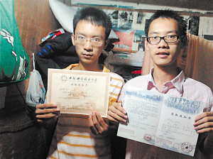 哥哥谢远成(右)和弟弟谢远衡(左)拿着录取通知书。冷婷 摄 记者 卿永锋 实习生 冷婷 袁英 日前,岳麓区雨敞坪镇新卯村爆竹声噼里啪啦接连不断,喧闹的欢声笑语使场面热闹非凡。该村谢家两兄弟哥哥谢远成和弟弟谢远衡今年分别以574分和649分考取哈尔滨工业大学和中国科技大学。 最牛班最能吃苦的一个 “谢远衡是我教书多年来,最能吃苦的一个学生”,长郡中学“高考最牛班主任”徐光明老师说,徐老师班里几乎所有的同学都参加了竞赛组,但高三后,都相继退出以备高考,而谢远衡是高考前3个月才退,那时学校的高考第一轮复习已经接近尾声了。退出竞赛后的谢远衡每天学到凌晨1时,用一个月的时间自己完成高考第一轮复习,“他完成了在常人看来不可能完成的任务,效果也不错”,徐老师十分赞许地说。 谢远衡有哮喘病,高考前一天,他突然咳个不停,他清楚是老毛病又犯了,为了不让父母和老师担心,他一个人偷偷去学校医院打了一针,本以为病情得到遏制了,但他没想到6月7日下午高考数学时,他又开始咳嗽,那时他才明白,病情不仅没有好转,反而更严重了,考场上他十分难受,但是又怕咳嗽声影响到其他同学,于是他一边考试一边用手捂住自己的嘴,“想咳不能咳真的很难受,我只是想忍着,考过了就好,可没想到最终还是失手了”,谢远衡说,最拿手的数学还是因为病情发作而发挥失误,最后他以2分之差与梦寐以求的北大失之交臂,“虽然说自己考砸了,但是很庆幸没影响到别人”。 儿子懂事了,知道关心妈 妈妈一直患有腰椎盘突出,一次无意中谢远成听到母亲说,有一个治疗腰椎盘突出的仪器很不错,但要一千多元。为了省钱供他们读书,家里已经非常拮据了,花上千元买治疗仪,母亲舍不得。 高考完后,兄弟俩就商量着,无论花多少钱也要为母亲买下这个治疗仪。所以一高考完,他们就去找兼职赚钱,当洗碗工,做保安,发传单,做家教。一个月的辛苦工作,兄弟俩终于赚够了钱,给母亲买了经络治疗仪,哥俩偷偷拿回家里藏起来。饭后,他们帮母亲收拾好饭桌,取出仪器,打开包装,惊喜的妈妈眼里闪着激动的泪花,她站起来,摸着他俩的头说,“我儿子真的懂事了,知道关心妈妈了。” |