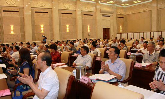 省委副书记梅克保(左二),省人民政府副省长李友志(右二)出席会议并讲话。省政协党组副书记许云昭(左一)当选为第三届理事会理事长。第二届理事会理事长刘玉娥(右一)作换届大会工作报告。