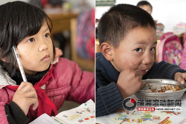 (12月14日,浏阳市荷花街道新兴小学樟槽教学点,午餐时间,学生们都吃得很香。寒风从没有玻璃的窗子灌进教室,但是没有打断学生认真听讲。图/潇湘晨报滚动新闻记者 谢长贵)