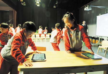前日,2013年中国学前教育技术协会年会在省政府直属机关第二幼儿园召开。图为吕奕老师利用新技术在展示主题为“夜晚多美好”的公开课上,孩子们在体验平板电脑教学。 石祯专 摄