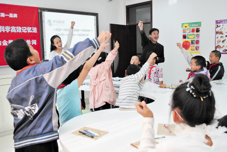 白金老师运用“爱思顿英语单词科学高效速记法”,教孩子们在玩中快乐学英语,让孩子的学习兴趣高涨。 彭放 摄