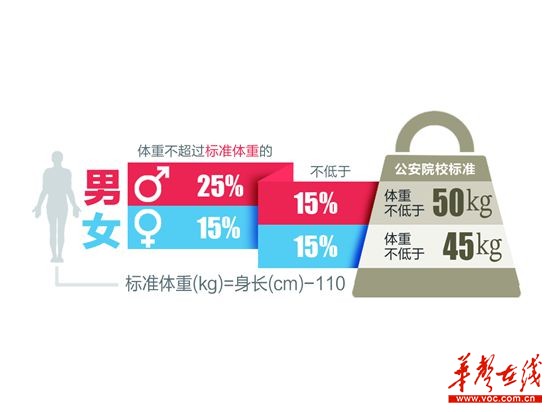 对于体重超标的考生,是否会因为肥胖而不予录取?军校、武警、公安院校和飞行专业等对体重有明确要求。军队、武警院校标准:男性体重不超过标准体重的25%、不低于标准体重的15%,女性体重不超过标准体重的15%、不低于标准体重的15%。标准体重的计算公式为:标准体重(kg)=身长(cm)-110。公安院校标准: 男性考生体重不低于 50 公斤;女性考生体重不低于 45 公斤;身体匀称。除了以上院校外,考生在填报其他院校志愿时,也要查看院校当年《招生章程》,看其中是否对体重有要求,避开受限的院校和专业。(三湘华声全媒体记者 贺卫玲 戴科)