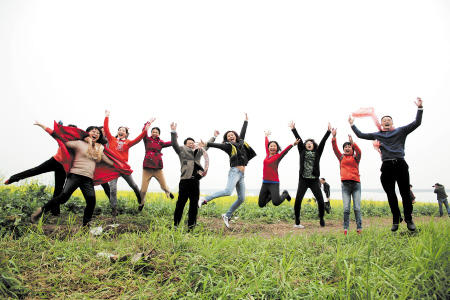 站在故乡的油菜花地上,年近七十的杨明球老师(前排着灰色西装者)也欢快地跟着学生们跳了起来。刘彬 摄