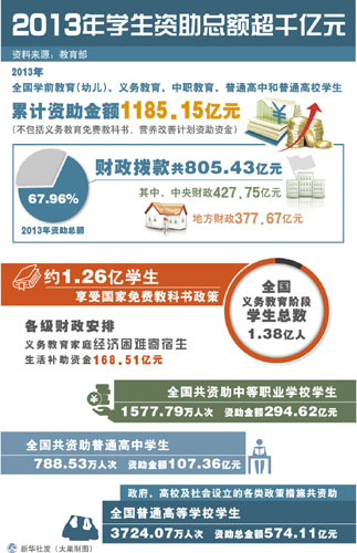 2013年全国学生资助总额达1185.15亿元,确保不让一个学生因贫失学——