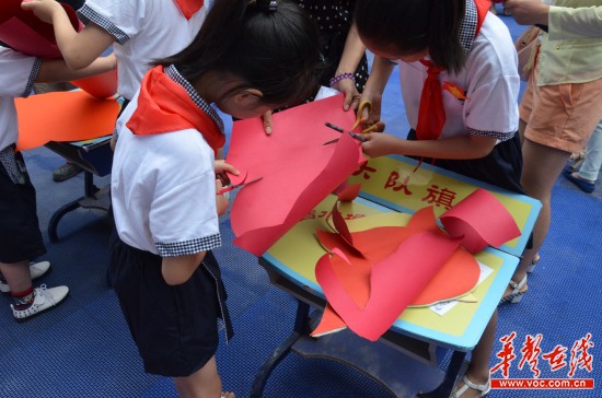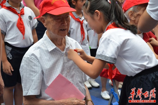 在现场,两名少年队员满怀敬意地给老兵佩戴“胜利花”。曾经参加过长沙会战的易唯城老兵在和孩子们回忆60多年前的抗战岁月时,勉励孩子要珍惜今天的幸福生活,发奋图强,早日成为国家的栋梁之材。