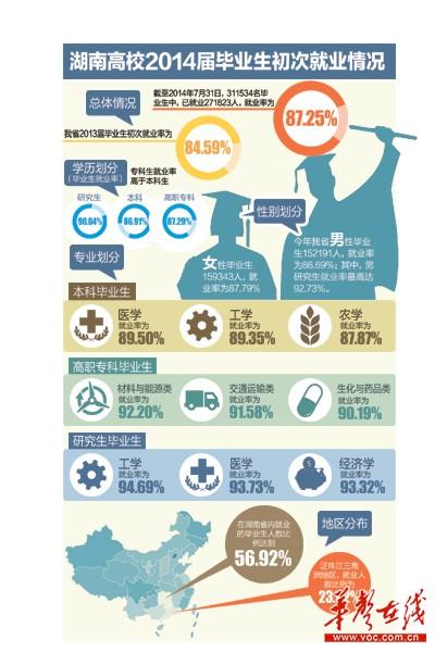 2014届311534名毕业生中,已就业271823人,就业率为87.25%,比去年高近3个百分点。