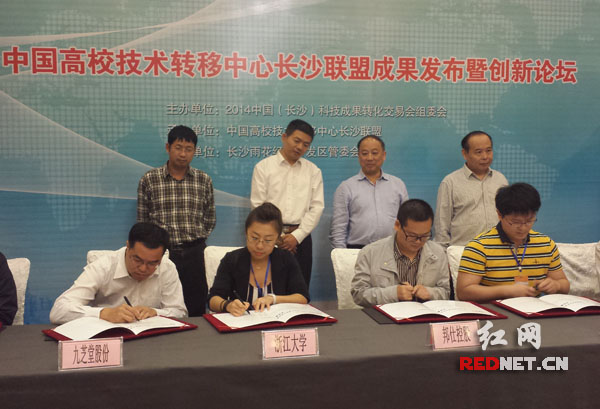 今日,2014中国(长沙)科技成果转化交易会特色专场活动——“中国高校技术转移中心长沙联盟成果发布暨创新论坛”召开。14家高校与长沙企业进行了合作项目签约仪式,签约金额近3000万元。省、市有关领导,高校代表、相关企业,以及新闻媒体记者等共计100余人参加。