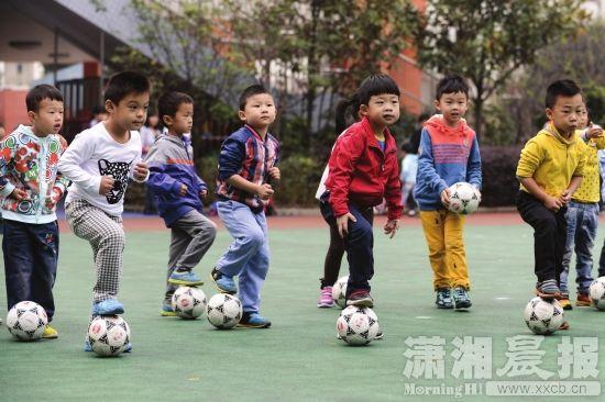 (2014年10月24日,长沙市教育局幼儿园八方园,小朋友一大早就赶到幼儿园参加足球课。图/潇湘晨报记者 谢长贵)