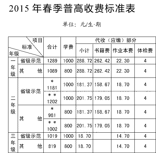 2015年春季普高收费标准表 单位:元/生·期 *为侧重于文科学生的收费金额,**为侧重于理科学生的收费金额。