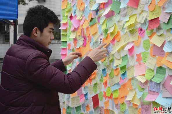 另外,中南大学还准备了女生许愿墙,一大早,贴满纸条的许愿墙就被抬出来放在升华广场里,让路过的男生挑选心愿并帮女生实现愿望。其中,一名商学院男生两度来到许愿墙前,在琳琅满目的心愿条中仔细寻找,执着的他终于带走了女友的心愿。(时刻新闻记者 刘力 通讯员 冷继颖)