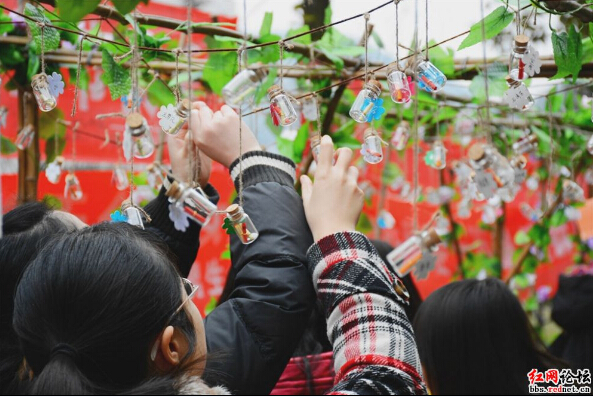 (信息院720个心愿瓶在心愿棚下供女生们挑选。图/郑晓光)