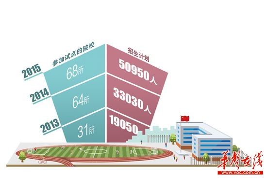 根据部署,2015年全省高职院校单独招生规模将扩大到招生总计划的30%。预计到2017年,我省单独招生规模进一步扩大,基于单招的分类招考将成为高职院校录取学生的主渠道。 ■制图/陈琮元