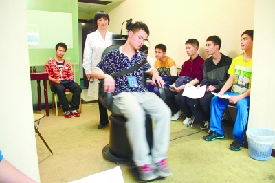 在模拟飞行能力测试环节,考生必须要过“转椅”关。所谓“转椅”,是指考生坐在特制椅上,通过模拟飞行员在高空飞行的感受来检查前庭神经功能。记者在现场看到,工作人员启动按钮后,转椅开始以80转/分钟的速度匀速转动。旋转过程中,考生要根据机器发出的滴滴声,左右摆动头托。工作人员介绍,“考生从转椅上下来后,需静坐30分钟接受观察,一旦出现呕吐、大汗淋漓等情况,则被视为不合格。”