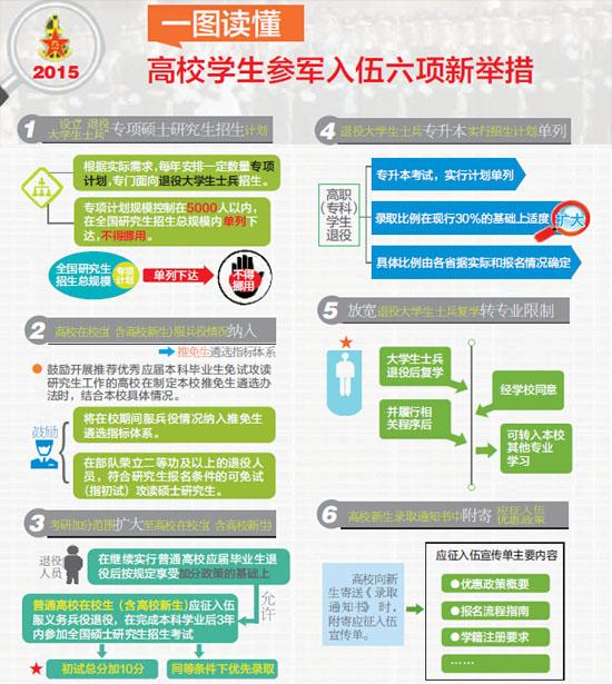 六项新政策加上已有优惠政策,教育部门鼓励大学生参军入伍政策体系初步形成:大学新生从收到录取通知书时,就能了解入伍政策和程序。高校学生入伍,不仅享受国家资助学费,而且复学有保障,可以转专业、优先转本校国防生,考研加10分、单列计划录取,专升本实行招生计划单列,录取比例超过30%。退役后就业的,除按应届毕业生办理就业手续、享受专门就业服务外,各地还拿出政法干警招录培养计划的20%,专门用于退役大学生士兵。(新华网)