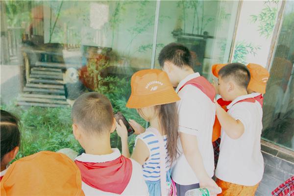 石门县二都乡中心小学同学们在观察熊猫吃竹子