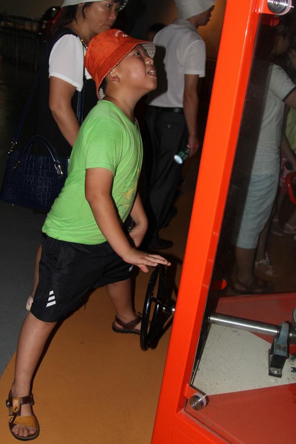 科技馆里的奇妙体验还包括看一场穿越主题的4D电影,飞碟在美国黄石公园、澳大利亚、喜马拉雅山顶、海洋、瀑布等不同时空中穿行,岩石碰撞、瀑布湿面、云雾遮目、鲨鱼来袭、海水冒泡、杂草扰腿等经历,既在银幕上演绎,同时又在观众身体上有强烈反应,不时引得人们尖叫。短短20分钟的电影过后,成人们多少有些冒汗、胆怯与终于释然的感觉;一个孩子却遗憾地说,“唉,就完了”。如此地意犹未尽,令人佩服。